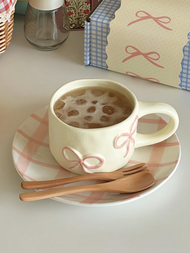Crafted from high-quality ceramic, the cup features a smooth, glossy finish with subtle pink bow accents that give it a charming, feminine aesthetic.