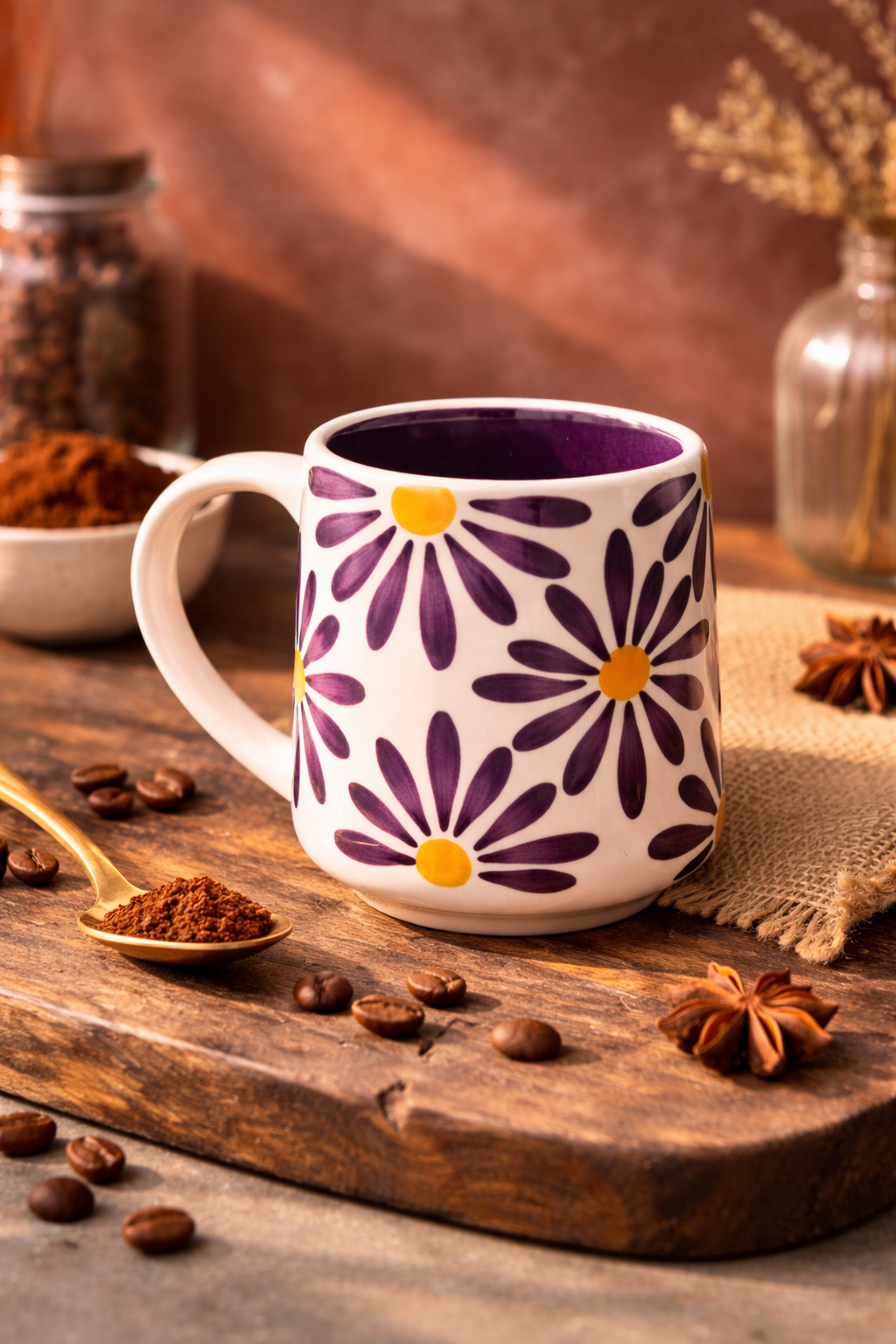 The Midnight Bloom Ceramic Mug is made for moments that call for warmth, comfort, and calm. Featuring hand-painted purple daisy patterns with soft yellow centers, this mug stands out with its rich, cozy character and deep-colored interior glaze that adds depth and elegance.